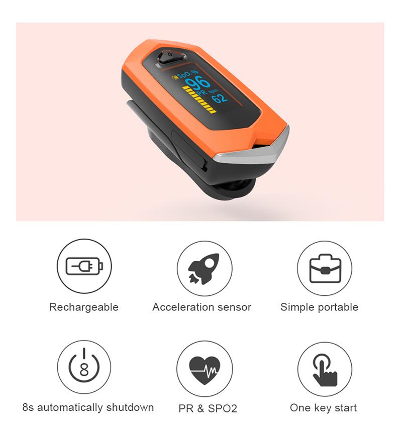 Jedna kľúčová hviezda, Môže sa dobíjať, snímač zrýchlenia, automatické vypínanie 8 s, meranie PR a SPO2, jednoduché prenosné
