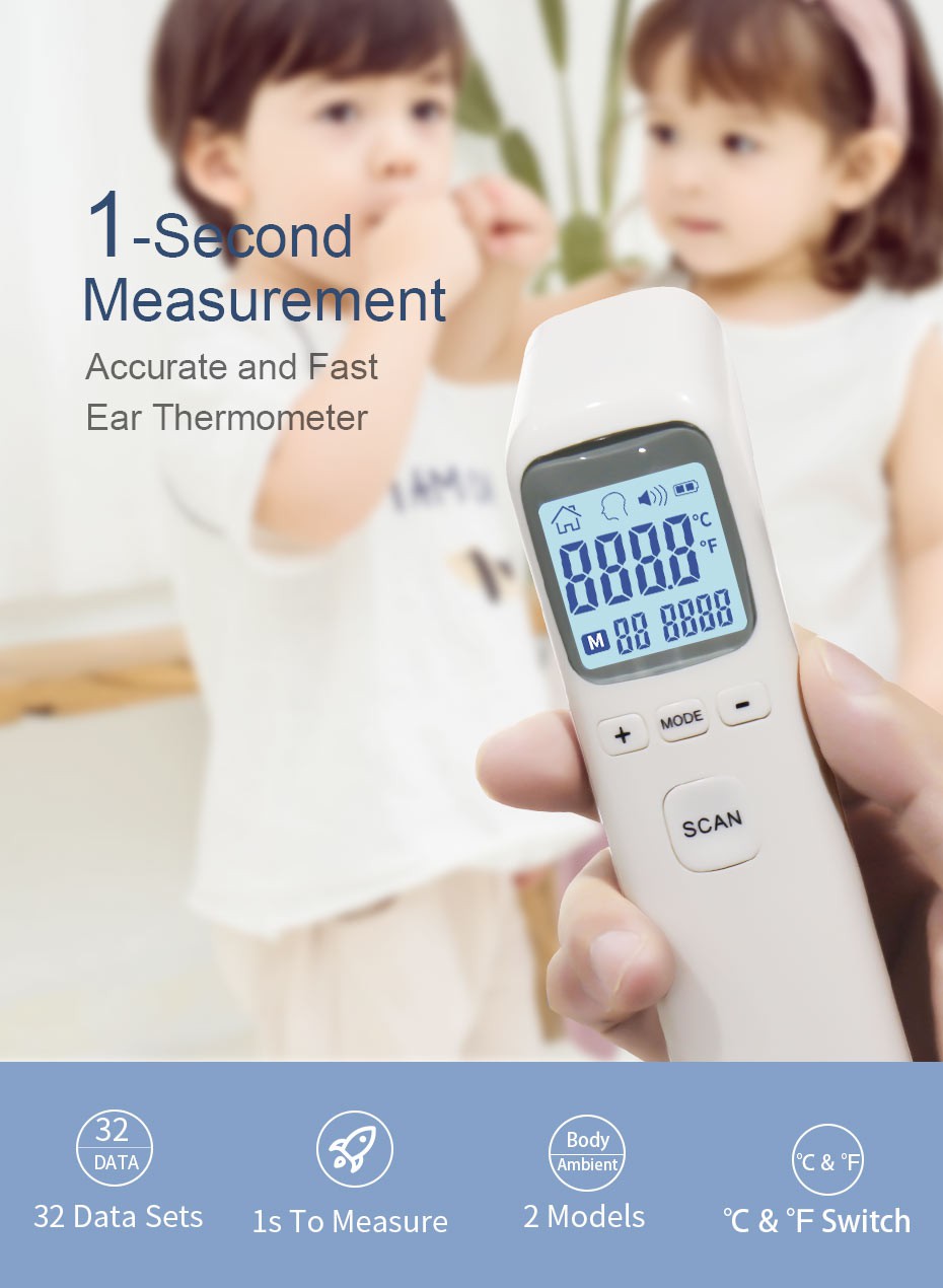 Bezkontaktný dizajn Bude hygienickejší a potenciálne znižuje šírenie baktérií alebo infekcií. Senzor udržiavajte v rozmedzí 3 - 5 cm od pokožky a získate dobré odčítanie. Presná hodnota odčítania Adoptujte pokročilú technológiu, zabezpečte, aby bezkontaktný teplomer poskytoval konzistentné merania s presnosťou +/- 0,2 deg.C rýchlo a ľahko. Je schopný zobraziť odčítanie do 1 sekundy, čo je veľká výzva pre bežný ortuťový teplomer. Celzia a Fahrenheita sú ľahko a okamžite prepínateľné pomocou prepínateľného LCD displeja a horúčka Alarm White podsvietenie poskytuje príjemnú žiaru pre ľahké čítanie v noci alebo v tme. A pípnutia sa vydajú, ak je nameraná telesná teplota vyššia ako teplota alarmu horúčky, môžete nastaviť teplotu alarmu horúčky v režime MODE Ďalšie operácie Nie je potrebné zapisovať poslednú zaznamenanú teplotu počas teploty, tento teplomer má zabudovanú pamäť, ktorá môže zaznamenať až 32 odčítaní vykonaných kedykoľvek